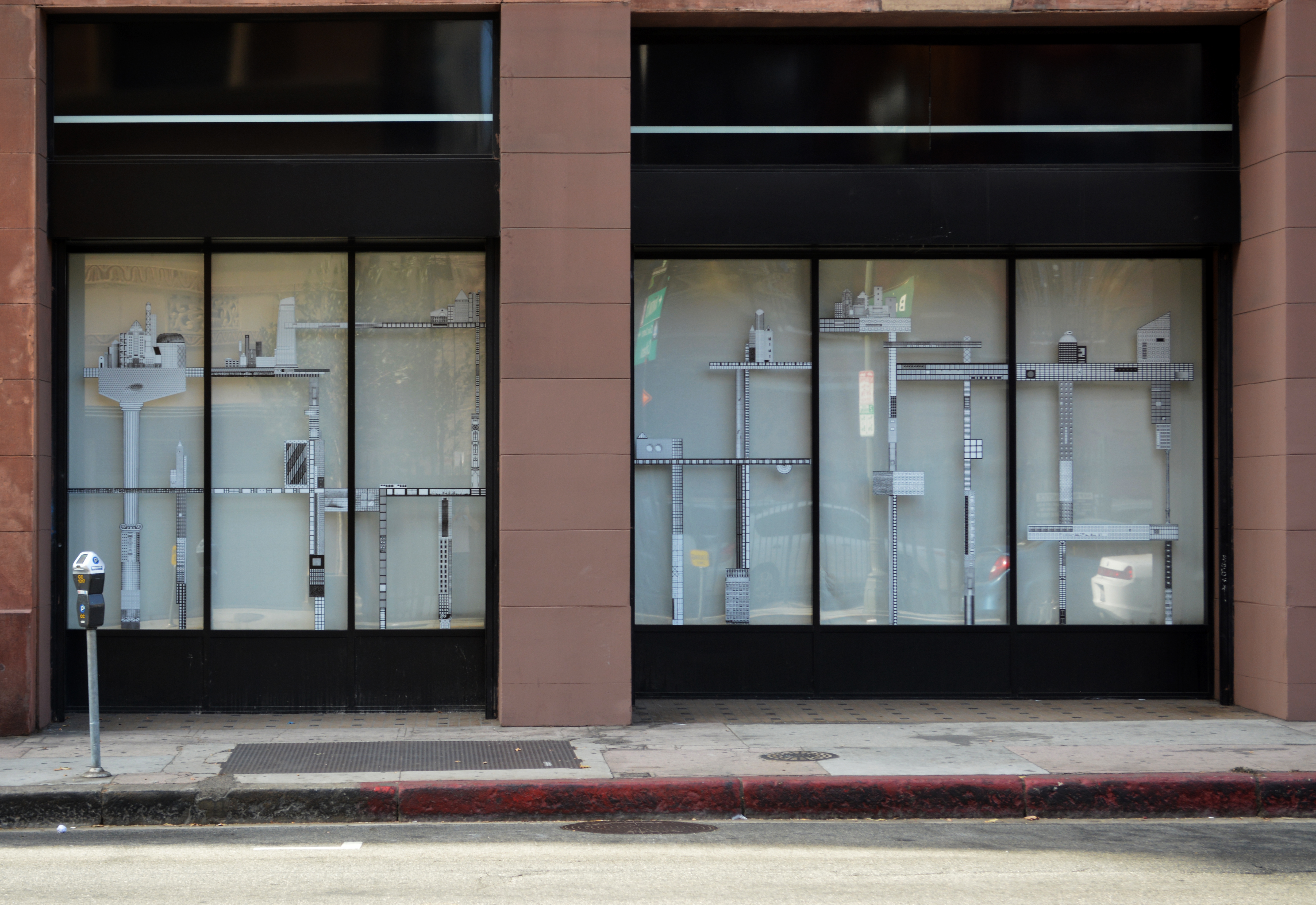 This architectural window display was commissioned by the A+D Museum in Los Angeles and installed at the Bradbury Building, over 3 months, for events and conferences that envisioned Downtown Los Angeles in 2040. Conceived of as a continuous and connected skyline, this window display appropriates existing elevations from the history of architecture along with elevations of iconic buildings in Downtown Los Angeles such as The Broad, The US Bank Tower, The Gas Company Tower, and Wilshire Grand. Each of these elevations are edited and cropped and kept at the same scale in relation to one another. Stitched together across 6 street front window bays, this composition consists of different textures and patterns generating a continuous elevation that is composed of many individual parts. As such, the window display is an architectural speculation - one that imagines a different type of skyline and urban organization for Downtown Los Angeles. This architectural window display collapses the distance of the space between these flattened architectural fragments such that each proposal willingly pins new with old, clean with messy, drawing with photograph, open with contained, tall with flat, bigness with smallness, order with disorder, and the singular with the many.