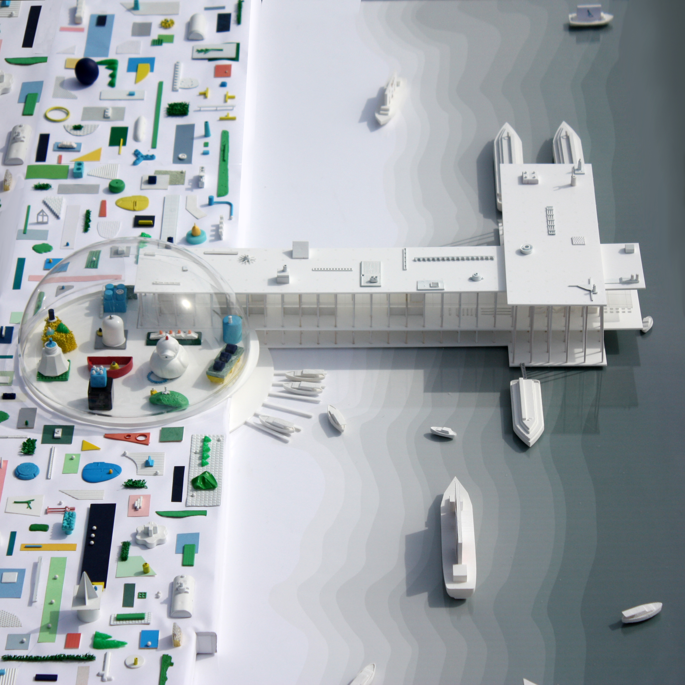 The Dome is the 1st component of the 3-in-1 conglomerate and is a social condenser that is a confluence point for the people of Seoul. Each of the architectural objects is isolated from each other and sits freely inside the Dome. Additionally, each one of the architectural objects is accessible from the ground, but also occupiable on their rooftops. Under the cover of the Dome, the roofs of each of these architectural objects create views across to each of the other architectural objects, the landscape river walk and views out to Han River. The volume of the Dome is populated by 11 architectural objects that contain activities such as a 1) hotel, 2) a train station, 3) souvenir stores 4) casino 5) music and movie venue 6) playground 7) restuarants and cafes 8) cultural center. Departure and arrival points for Yeoui-Naru Ferry Terminal are accessed through a Bar that pierces the Dome at its edge. The five boat slips located under the Dome are relegated for short-term mooring, water taxi loading, and a small craft drop-in point. Visitors access this level through the elevator or stairs in the Dome.